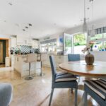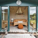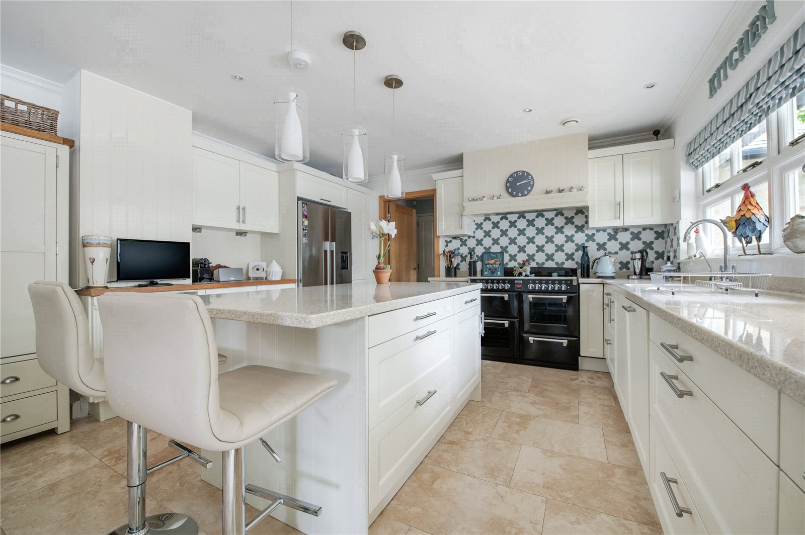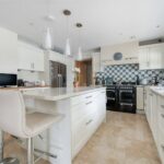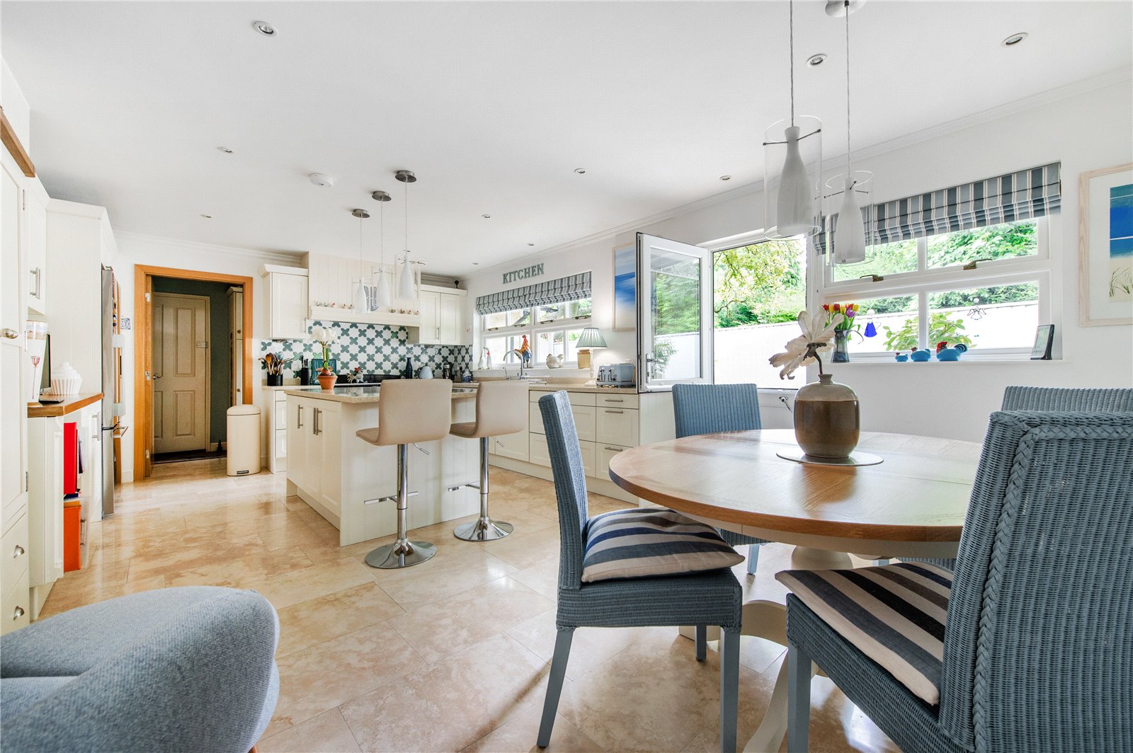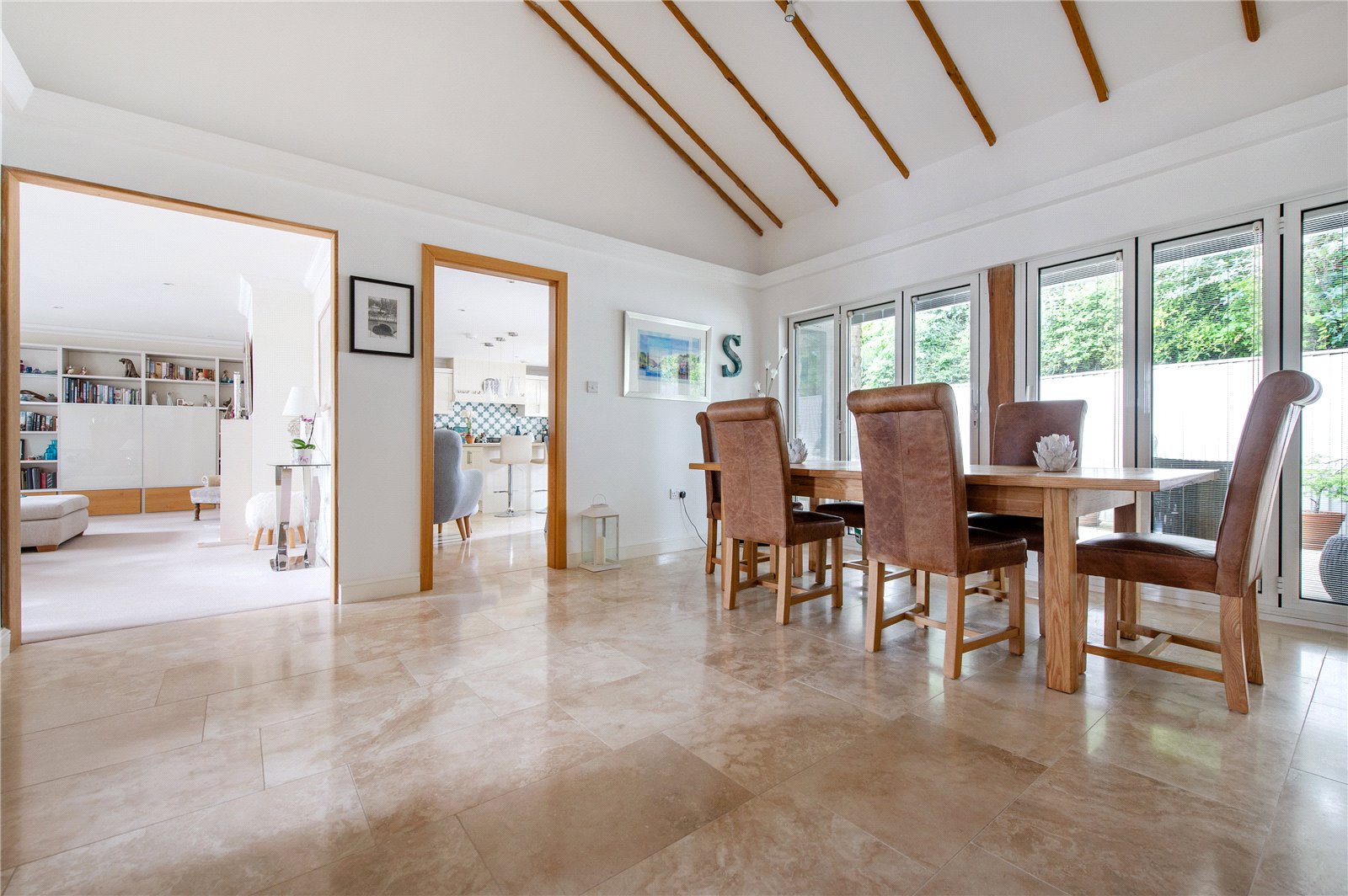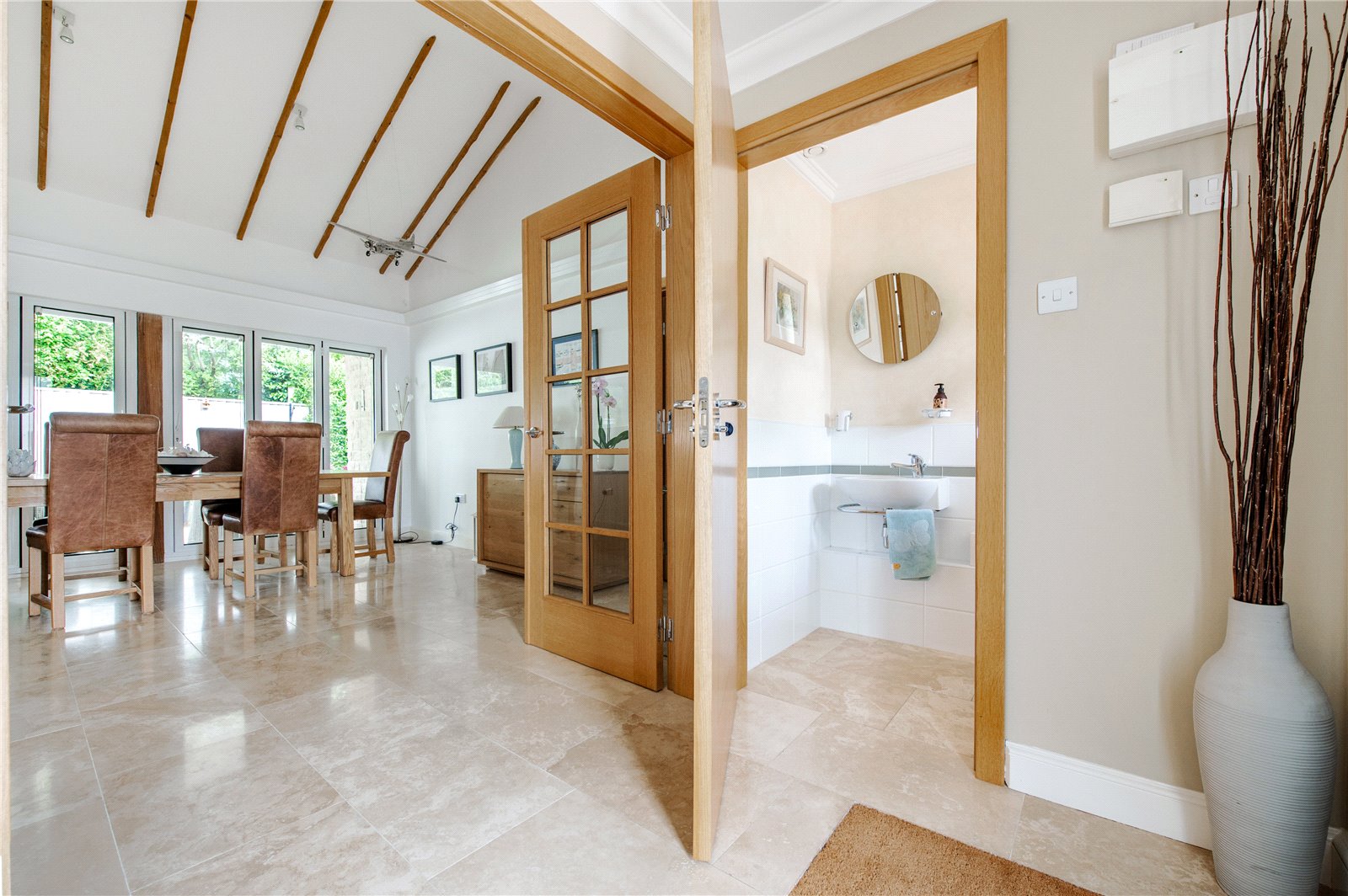 The vendors say: “We had always wanted to design and build our own home and were extremely fortunate when this plot, so conveniently located for the city of Bath, and close to a National Trust conservation area, became available twenty years ago. We designed this Bath stone home with natural slate roof to be comfortable and efficient, that is just as easy to live in for a family as for a couple. Entrance to the property is through a sliding automatic gate leading into a large driveway adjacent to the front garden. Automatic garage doors allow us to unload our shopping and enter the house through the utility room, especially useful when it’s raining! The utility room leads into the kitchen, which really is the heart of our home. With Travertine flooring and a German built cream shaker style kitchen and Corian worktops, this is a serene and light filled space. There is a large island with two breakfast stools, and we also have a dining table and chairs here. The kitchen has a large window over the sink with views of surrounding trees and there is also a vertical full-length window for views over the garden. The back door is a split ‘stable’ design leading to the deck. A second loft is located above the kitchen. The kitchen leads into the dining hall, a splendid room for entertaining with vaulted ceiling and exposed rafters, folding-sliding doors along the length of one wall on to a covered porch and a large deck extending along the rear length of the house. It really is the most amazing party house! The sitting room is open plan and off the dining hall with three large windows looking out over the front garden – a very bright and spacious room. One wall has Hulsta fitted wall units with sliding doors that cover the television when not in use. The front door enters a lobby with internal glazed double doors to the vaulted dining hall. Within the lobby is a WC and coats wardrobe. The wardrobe also contains the manifold for the heating system so outdoor coats are dried and warmed by the hot water pipes – an unexpected feature, especially in the depths of winter!”