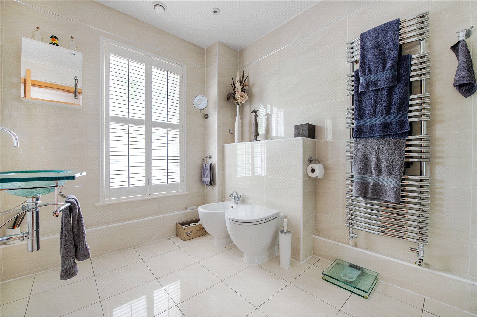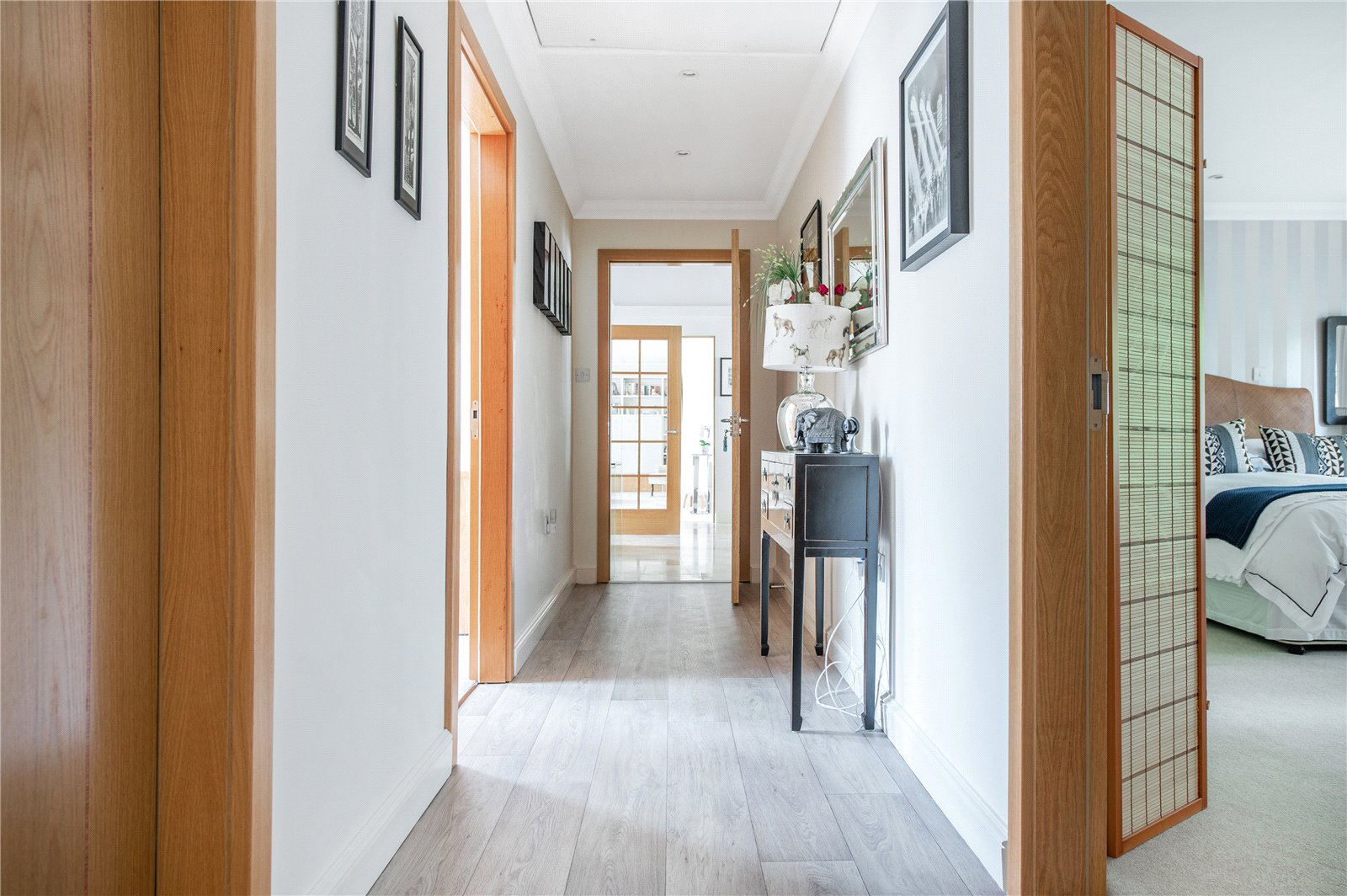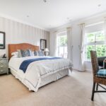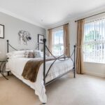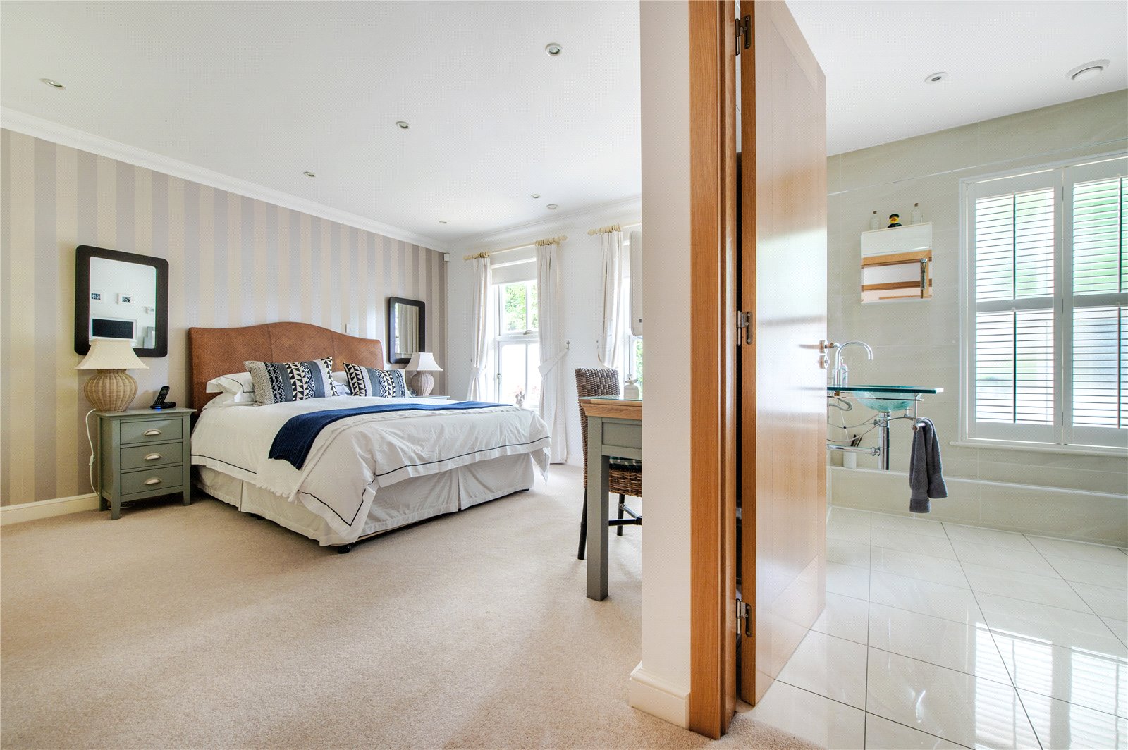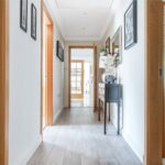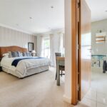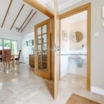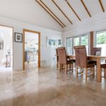 “The four double bedrooms are accessed through a door from the dining hall which leads into a wide hallway from which the boarded and attic trussed loft is accessed through an unusually large hatch. On the right is bedroom four. Next to this is the large family bathroom with two hand basins, a bath, separate shower, WC and window with ‘Colonial’ wood shutters. Next to this is a double bedroom with fitted wardrobes. At the end of the hallway is a large walk-in airing cupboard with radiator. The third bedroom is on the left and has sliding-folding doors out to the garden. The principal bedroom is also on the left-hand side, with fitted wardrobes and an en suite shower with WC, bidet and glass wash basin and window with ‘Colonial’ wood shutters. All the bedrooms are carpeted and decorated in a neutral style and each have two double glazed windows with low sills. The house has underfloor heating throughout and a ‘warm roof’ with insulation in the pitched roof between and over the rafters, as well as a mechanical ventilation and heat recovery system so that the house always has fresh air and there is never condensation on the windows or bathroom mirrors.”