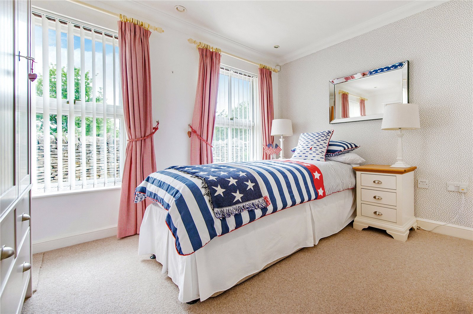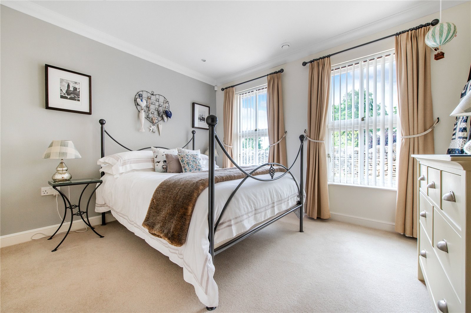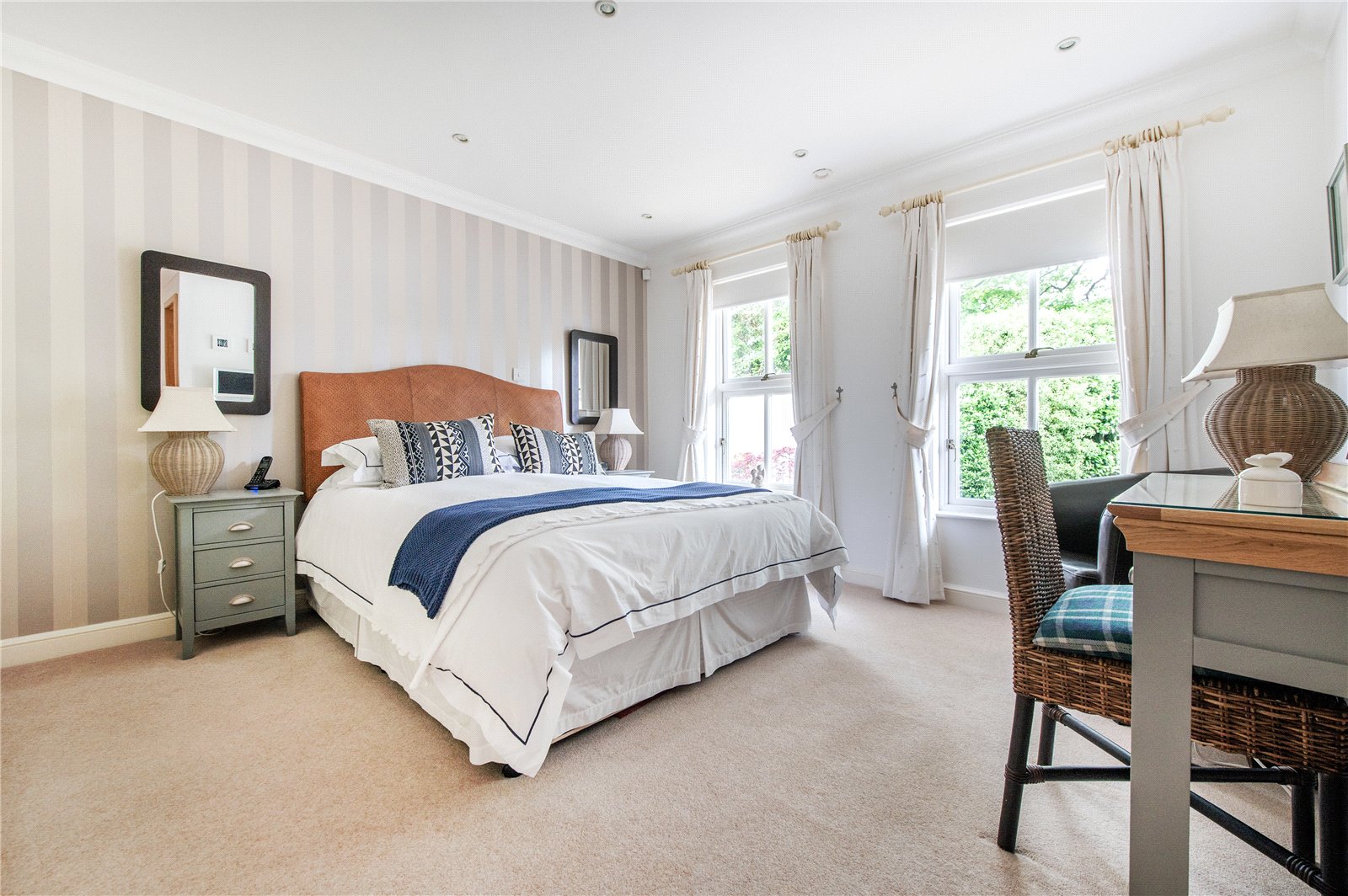 “The four double bedrooms are accessed through a door from the dining hall which leads into a wide hallway from which the boarded and attic trussed loft is accessed through an unusually large hatch. On the right is bedroom four. Next to this is the large family bathroom with two hand basins, a bath, separate shower, WC and window with ‘Colonial’ wood shutters. Next to this is a double bedroom with fitted wardrobes. At the end of the hallway is a large walk-in airing cupboard with radiator. The third bedroom is on the left and has sliding-folding doors out to the garden. The principal bedroom is also on the left-hand side, with fitted wardrobes and an en suite shower with WC, bidet and glass wash basin and window with ‘Colonial’ wood shutters. All the bedrooms are carpeted and decorated in a neutral style and each have two double glazed windows with low sills. The house has underfloor heating throughout and a ‘warm roof’ with insulation in the pitched roof between and over the rafters, as well as a mechanical ventilation and heat recovery system so that the house always has fresh air and there is never condensation on the windows or bathroom mirrors.”