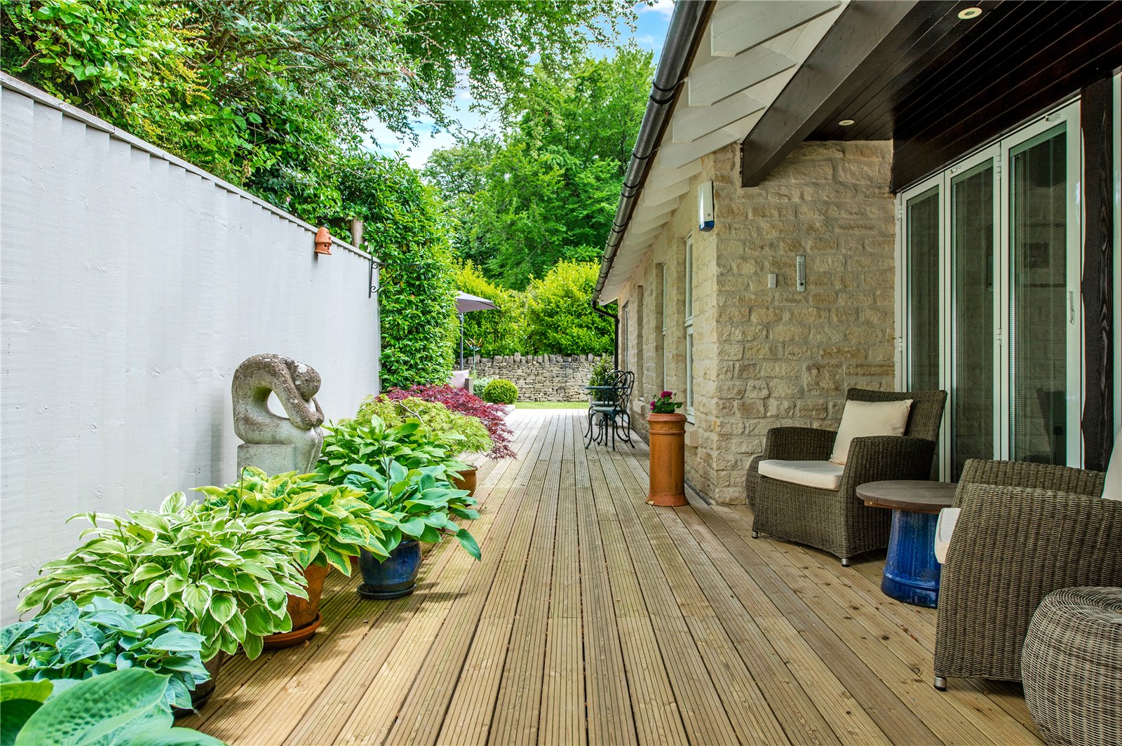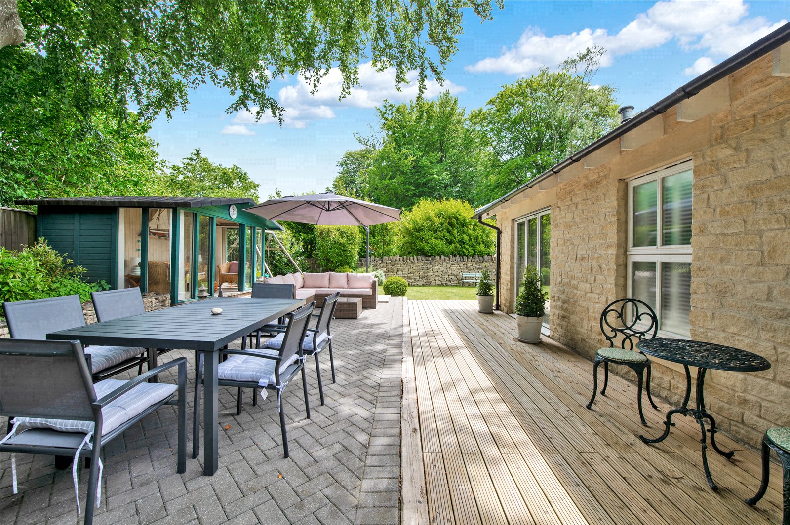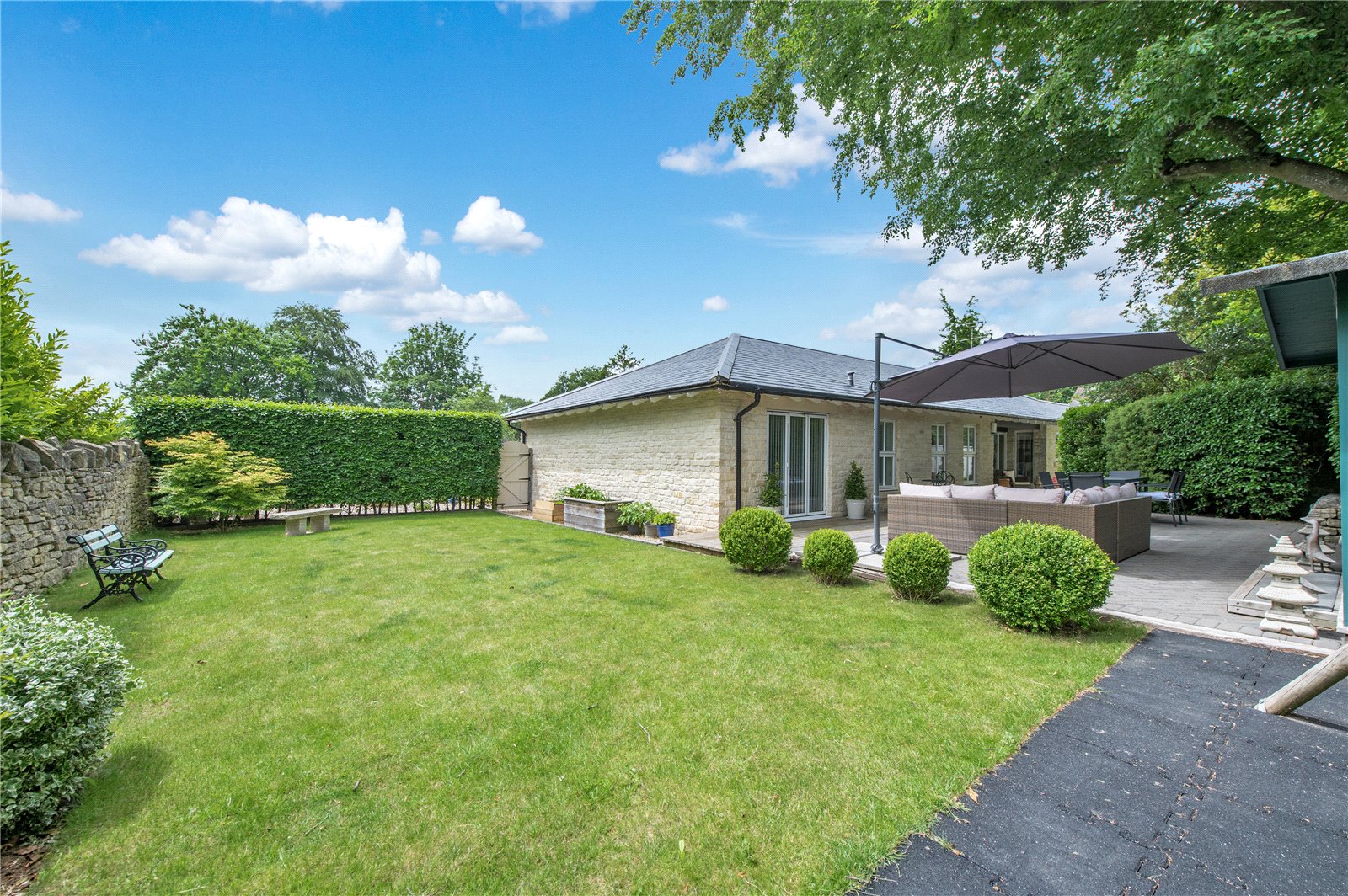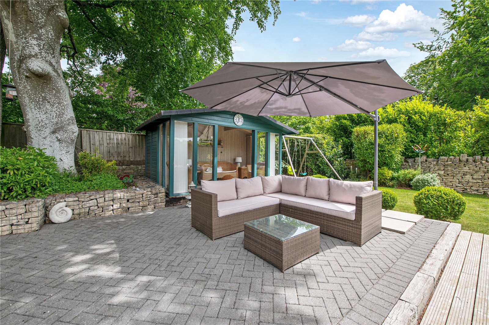 “The garden at the front is extremely low maintenance with gravel and stone, bushes and grasses and has a Mediterranean feel. The driveway to the garages is block paving, with room for several cars as well as two in the garage. The garage is large enough for two cars, workbench and space for a second fridge/freezer. The gas boiler, hot water tank and water softener are located in the garage. There is also a large standing Bath stone in the garden which was excavated during the original building works. Another feature is a gabion wall beside the drive with seating. There are dry stone walls around the property and gates at each end of the building lead to the back garden. This is partly laid to lawn with a timber summer house with double doors at the front, vertical blinds, and electricity. The summer house has a large cupboard for storing garden furniture and at the rear is a larger storage area suitable as a garden shed and accessed through a hidden door. There are two large ancient beech trees and a patio suitable for an outdoor dining table and chairs. There is also decking along the back of the house. The house benefits from perimeter lighting under the eaves.”
