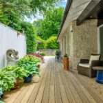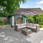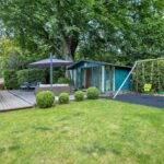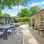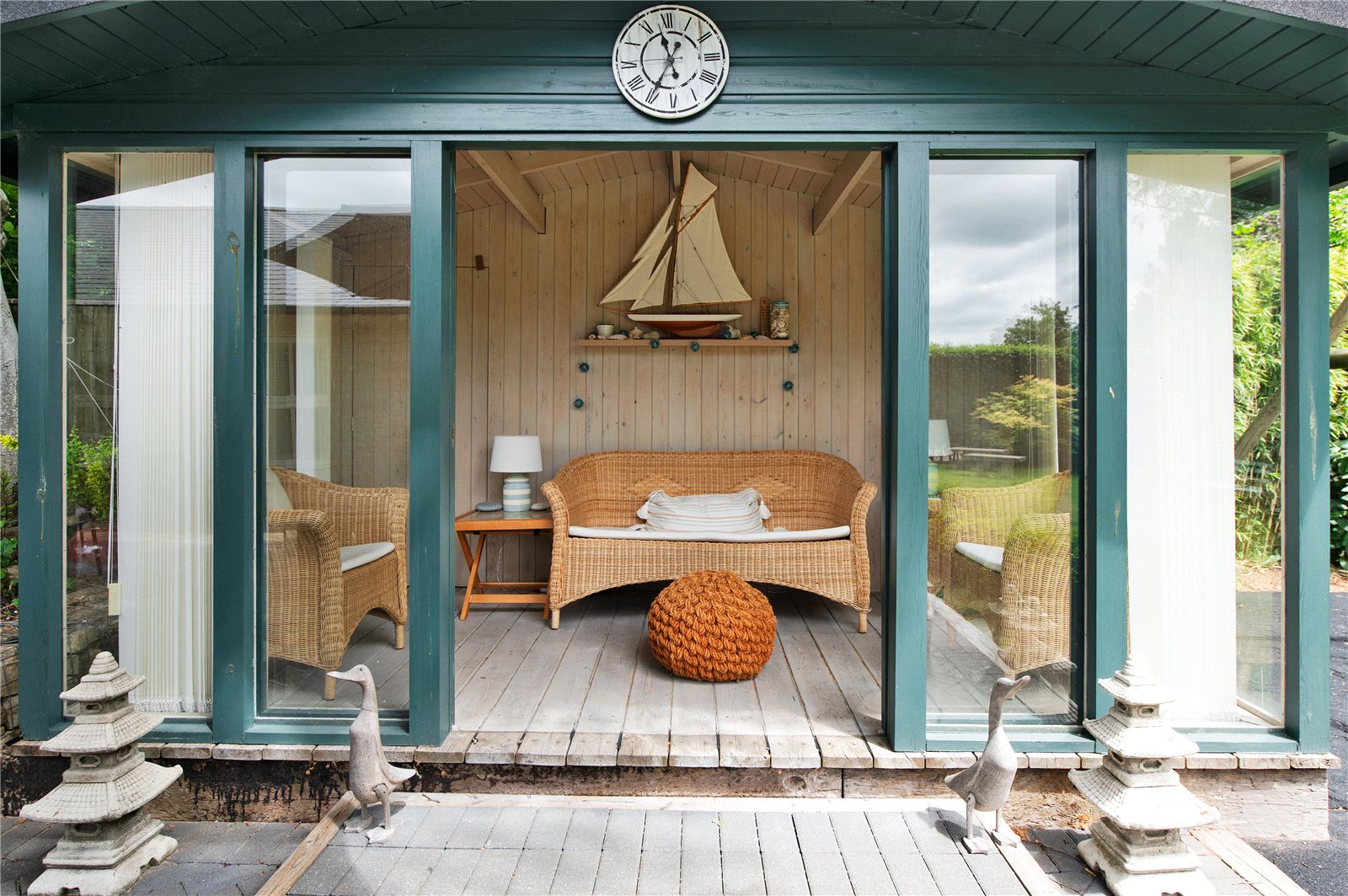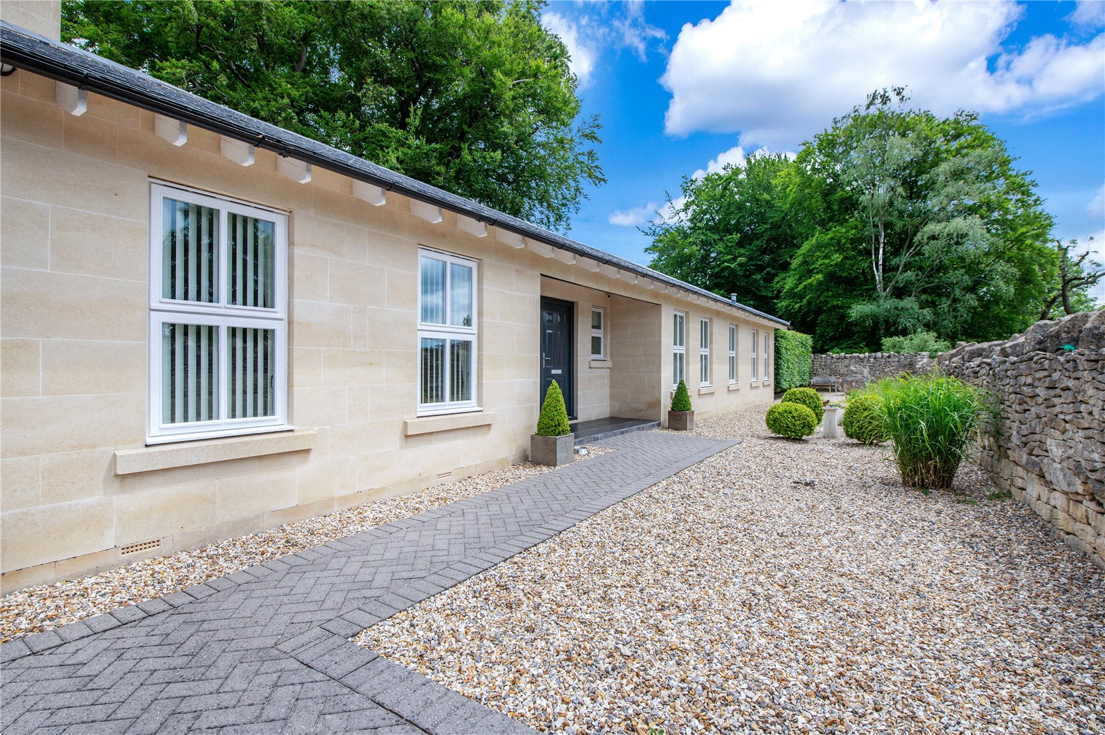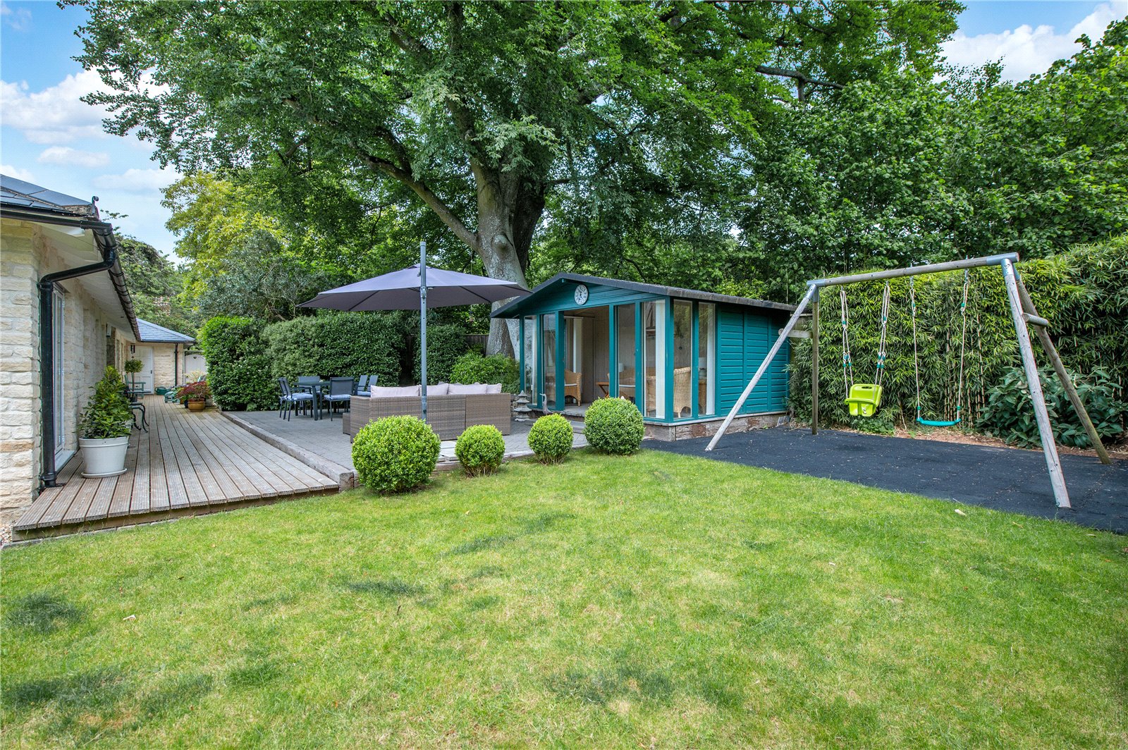 “The garden at the front is extremely low maintenance with gravel and stone, bushes and grasses and has a Mediterranean feel. The driveway to the garages is block paving, with room for several cars as well as two in the garage. The garage is large enough for two cars, workbench and space for a second fridge/freezer. The gas boiler, hot water tank and water softener are located in the garage. There is also a large standing Bath stone in the garden which was excavated during the original building works. Another feature is a gabion wall beside the drive with seating. There are dry stone walls around the property and gates at each end of the building lead to the back garden. This is partly laid to lawn with a timber summer house with double doors at the front, vertical blinds, and electricity. The summer house has a large cupboard for storing garden furniture and at the rear is a larger storage area suitable as a garden shed and accessed through a hidden door. There are two large ancient beech trees and a patio suitable for an outdoor dining table and chairs. There is also decking along the back of the house. The house benefits from perimeter lighting under the eaves.”