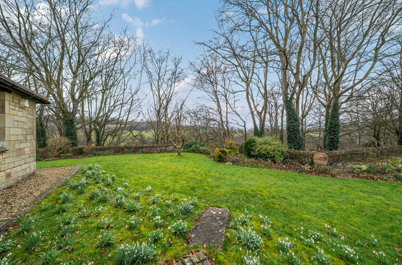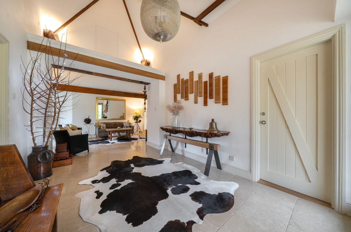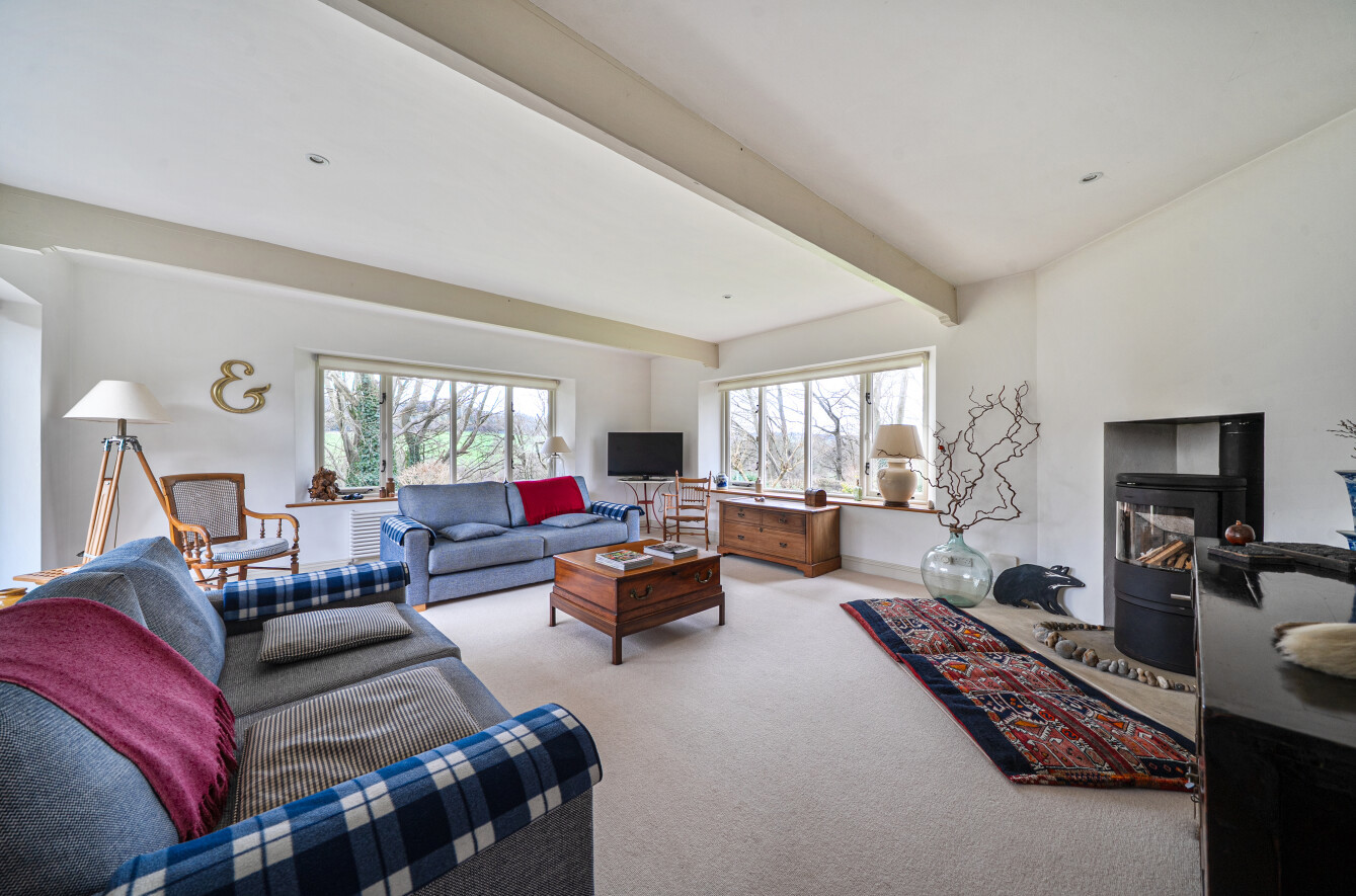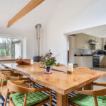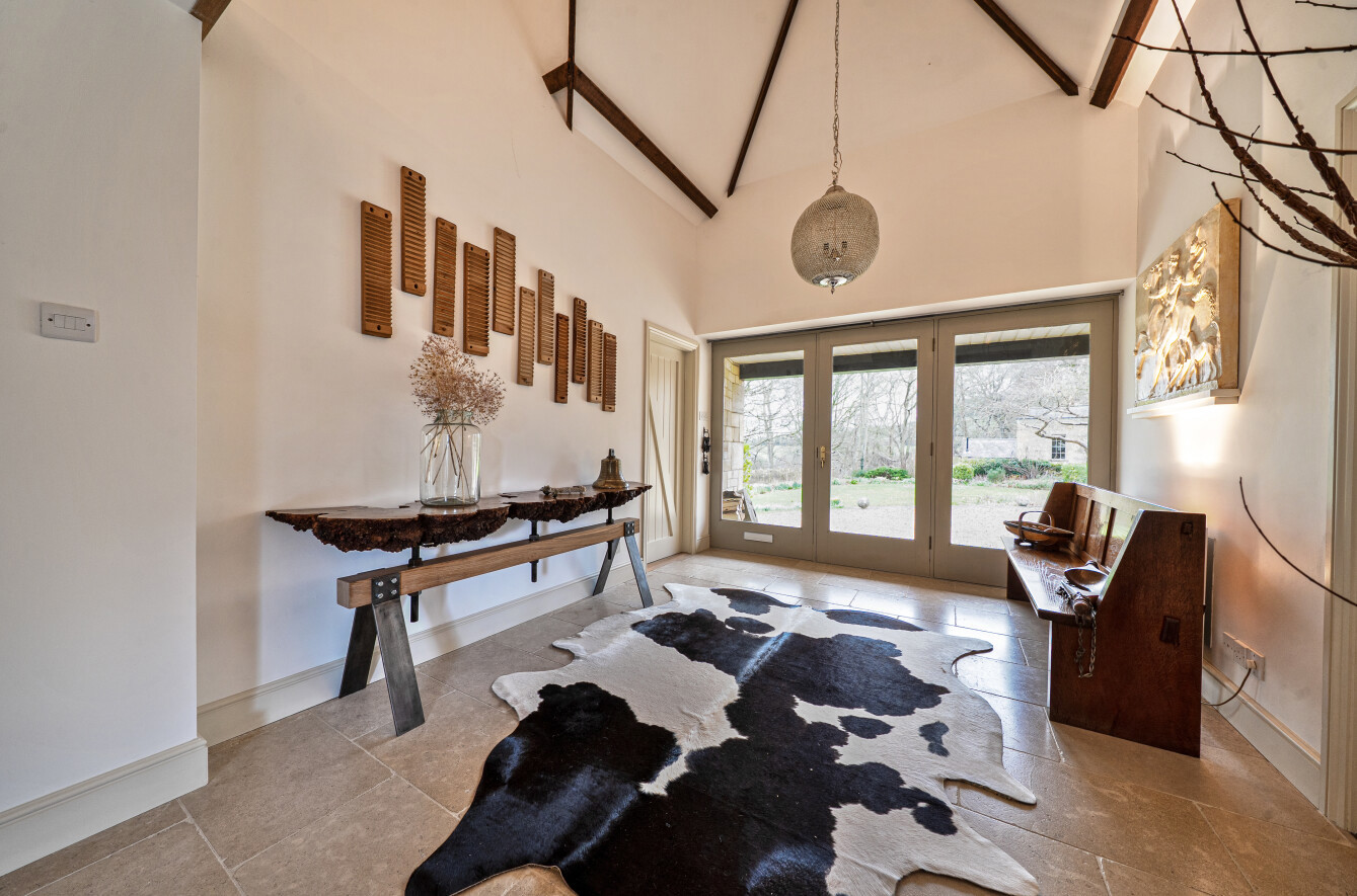 Arranged entirely on one easy level, the layout flows effortlessly, making it ideal for family life and entertaining. A vaulted ceiling crowns the entrance hall, opening into a welcoming reception space. The generous reception room leads through to the dining room, with doors onto a south-facing patio, creating a natural connection between inside and out. The sitting room enjoys triple-aspect views to the east, south and west, while each window frames a different outlook across the surrounding landscape.
