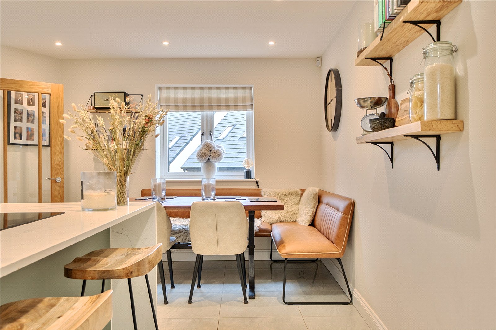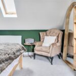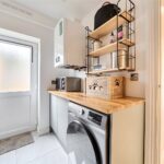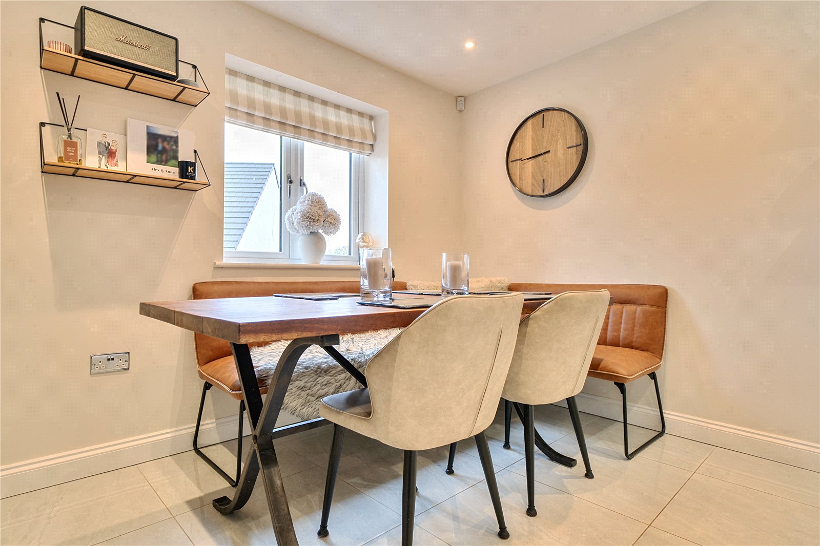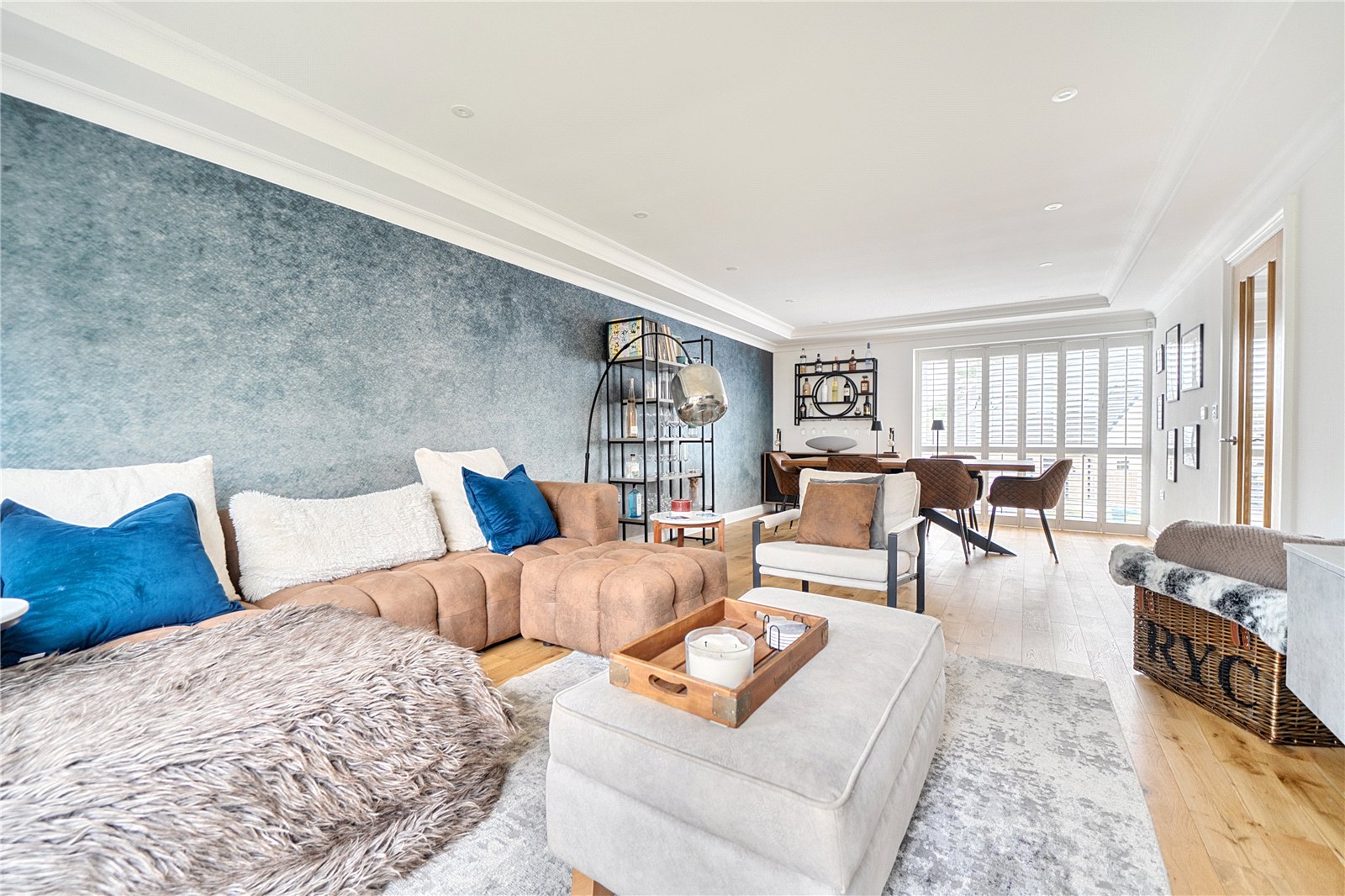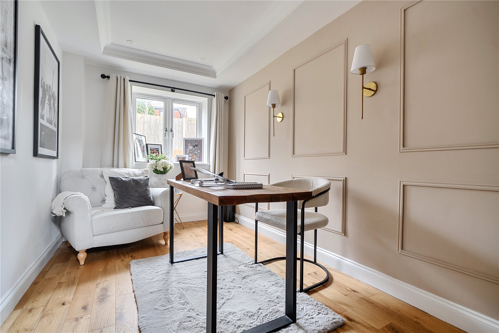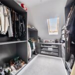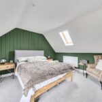 The ground floor comprises a sitting room, home office, kitchen/dining room, utility, and integrated garage. Upstairs, three bedrooms include a principal suite with walk-in wardrobe and en suite shower room, alongside a family bathroom. ‘The main bedroom has such a lovely high ceiling, and the double-height window on the stairs fills the space with beautiful morning light,’ the owners add. Since moving in, they have made enhancements to personalise the space, adding plantation shutters and custom touches to make it feel like home. ‘We’ve spent a fair bit of money to “de-new” the rooms and make the house feel more homely and individual. It’s been a really enjoyable project,’ they say.