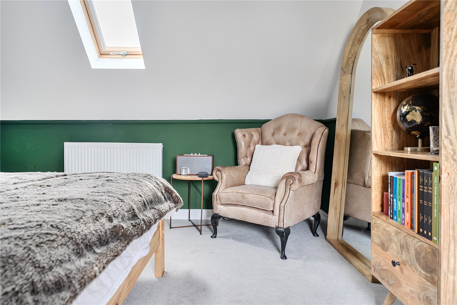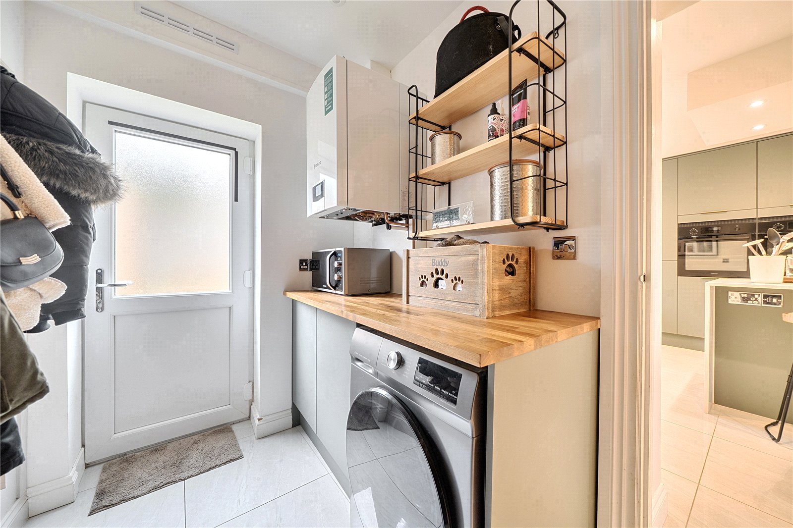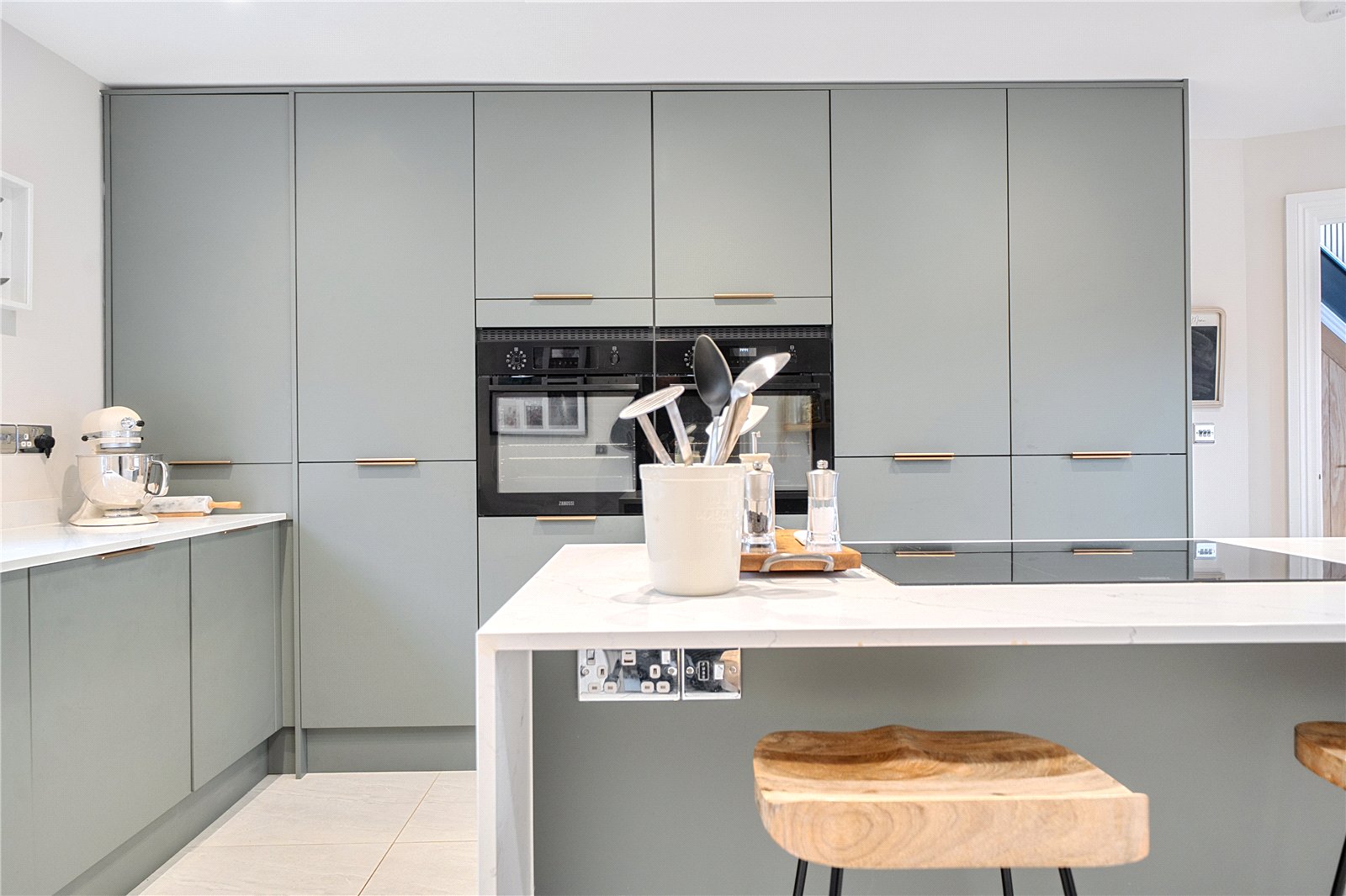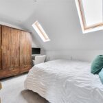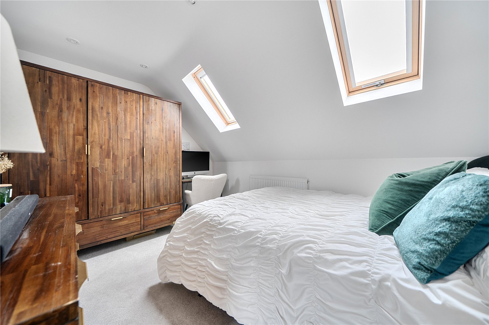 The ground floor comprises a sitting room, home office, kitchen/dining room, utility, and integrated garage. Upstairs, three bedrooms include a principal suite with walk-in wardrobe and en suite shower room, alongside a family bathroom. ‘The main bedroom has such a lovely high ceiling, and the double-height window on the stairs fills the space with beautiful morning light,’ the owners add. Since moving in, they have made enhancements to personalise the space, adding plantation shutters and custom touches to make it feel like home. ‘We’ve spent a fair bit of money to “de-new” the rooms and make the house feel more homely and individual. It’s been a really enjoyable project,’ they say.