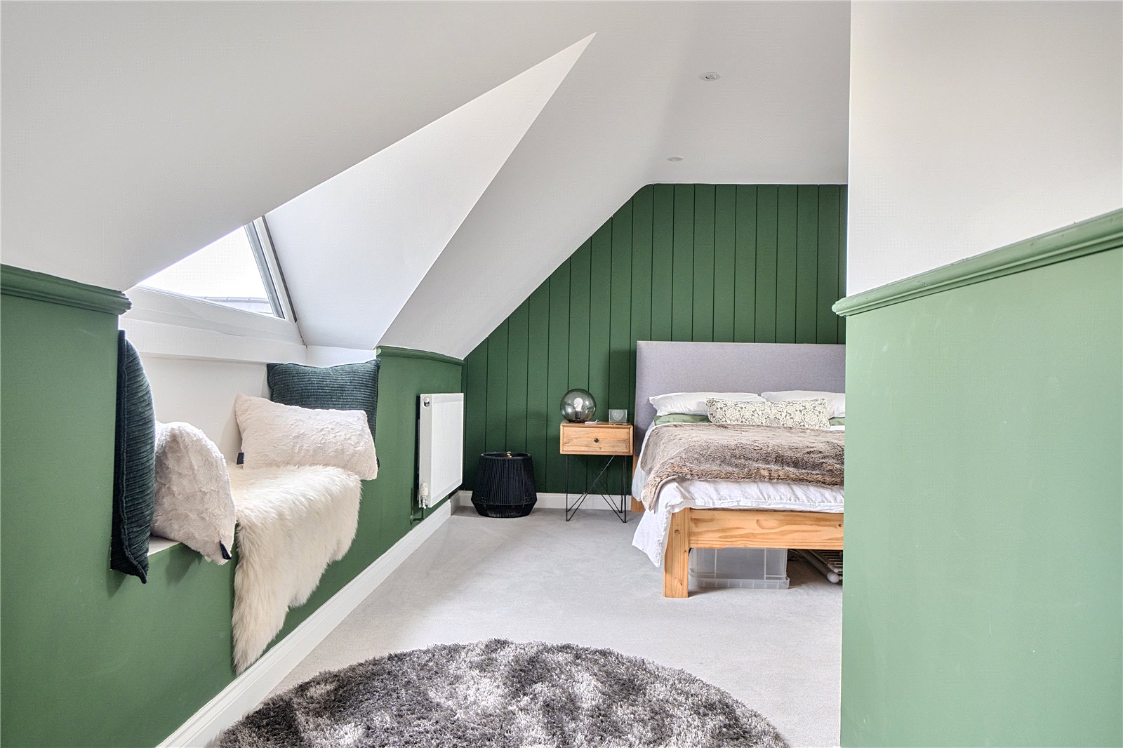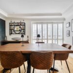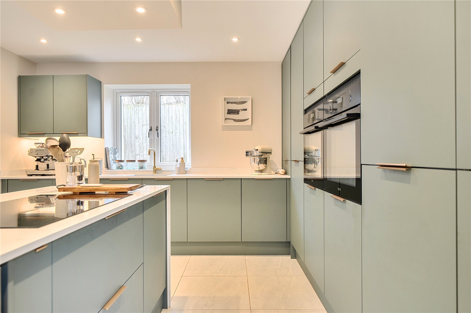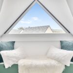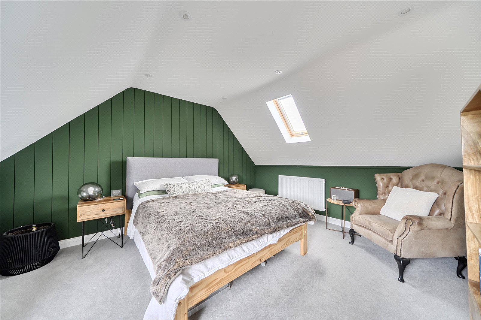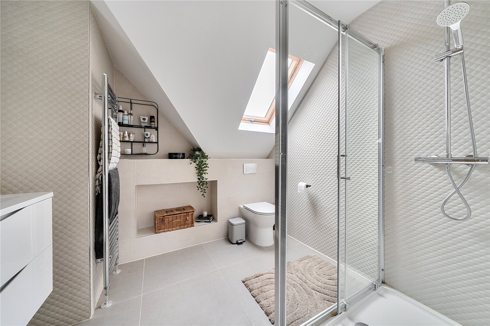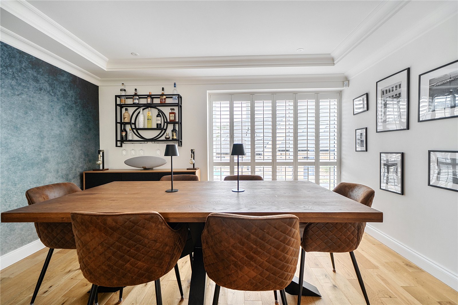 The ground floor comprises a sitting room, home office, kitchen/dining room, utility, and integrated garage. Upstairs, three bedrooms include a principal suite with walk-in wardrobe and en suite shower room, alongside a family bathroom. ‘The main bedroom has such a lovely high ceiling, and the double-height window on the stairs fills the space with beautiful morning light,’ the owners add. Since moving in, they have made enhancements to personalise the space, adding plantation shutters and custom touches to make it feel like home. ‘We’ve spent a fair bit of money to “de-new” the rooms and make the house feel more homely and individual. It’s been a really enjoyable project,’ they say.