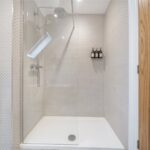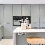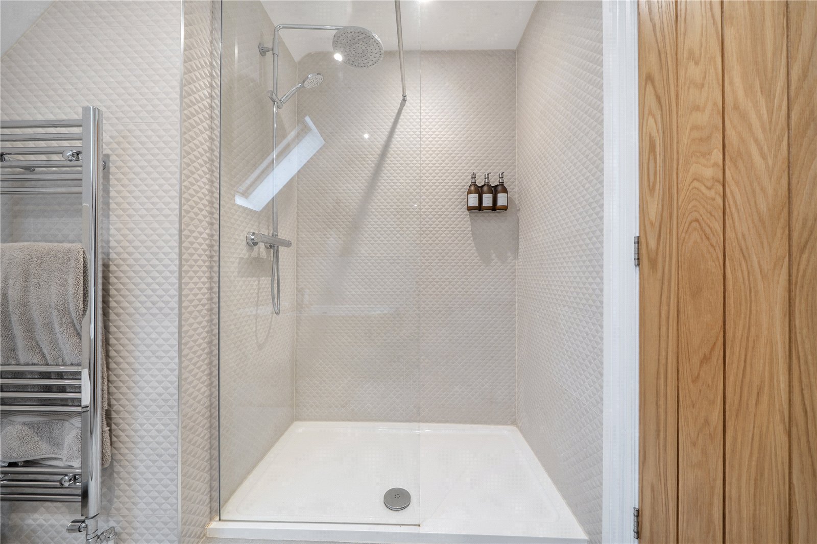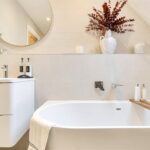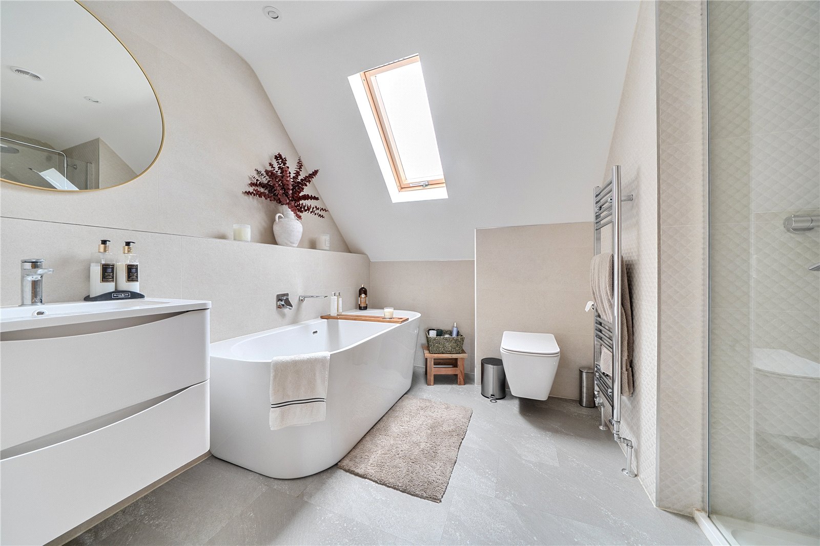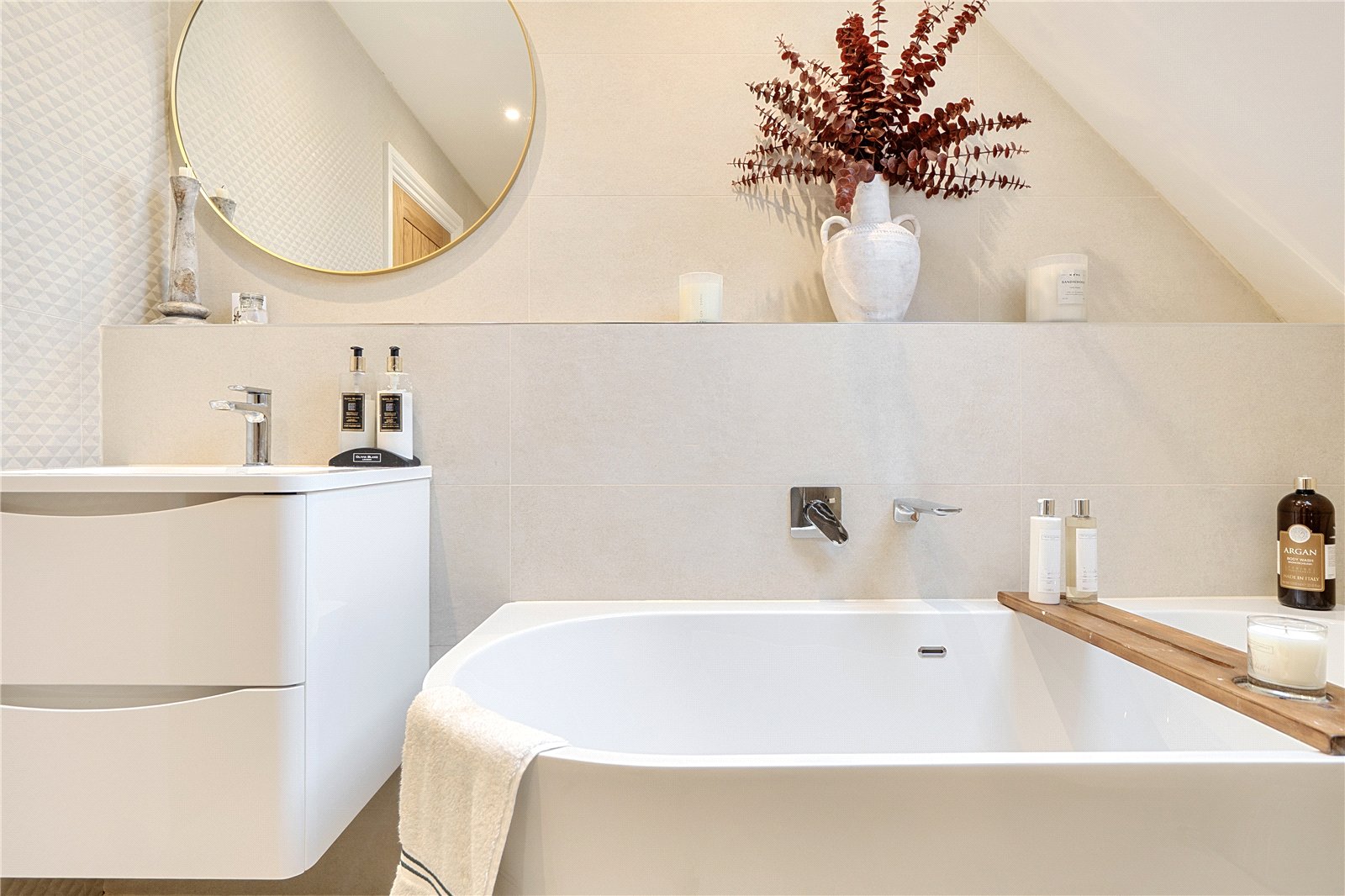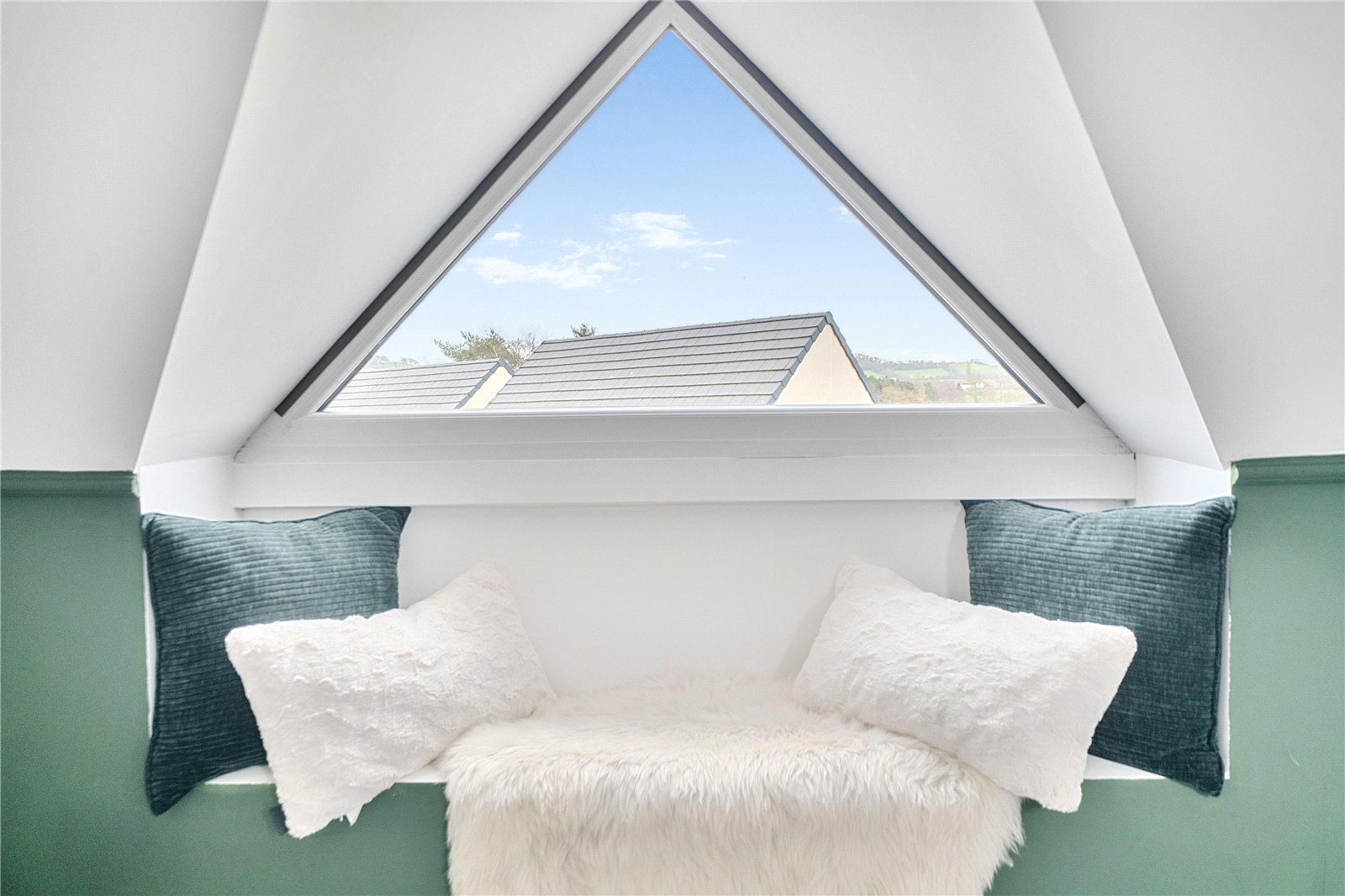 The ground floor comprises a sitting room, home office, kitchen/dining room, utility, and integrated garage. Upstairs, three bedrooms include a principal suite with walk-in wardrobe and en suite shower room, alongside a family bathroom. ‘The main bedroom has such a lovely high ceiling, and the double-height window on the stairs fills the space with beautiful morning light,’ the owners add. Since moving in, they have made enhancements to personalise the space, adding plantation shutters and custom touches to make it feel like home. ‘We’ve spent a fair bit of money to “de-new” the rooms and make the house feel more homely and individual. It’s been a really enjoyable project,’ they say.