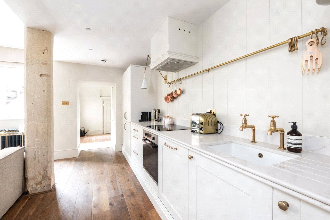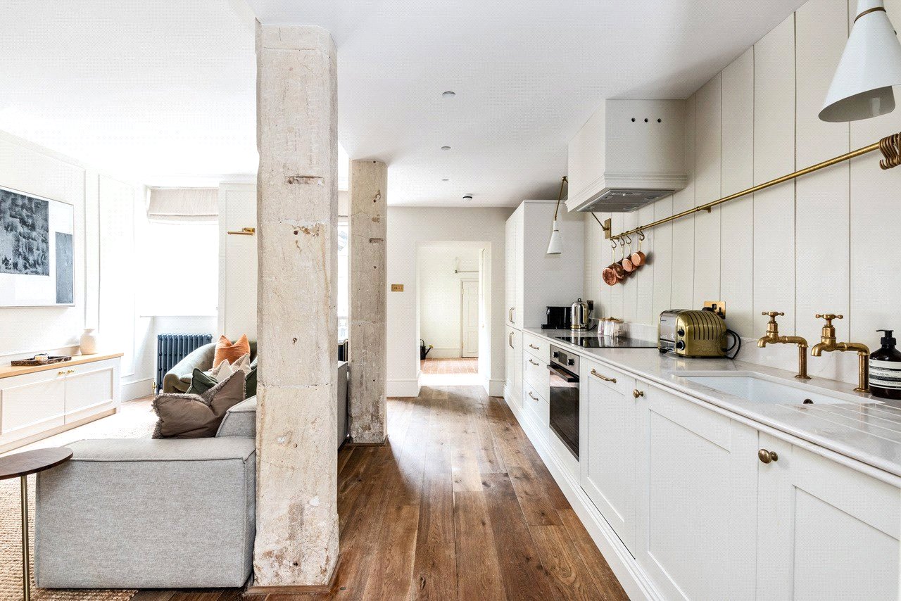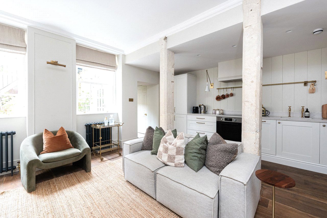 Tastefully renovated to feel contemporary while retaining period features such as sash windows and Bath stone pillars, this one-bedroom, single-level home offers ample space for entertaining, making it the perfect city residence or a lock-up-and-leave pied-à-terre.
