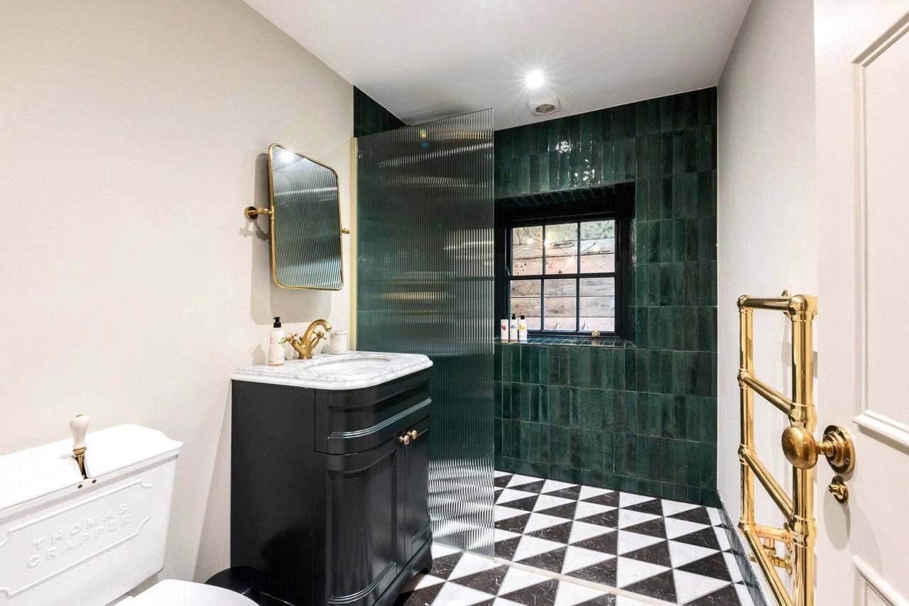 The wet-room bathroom is finished with marble flooring and a traditional Thomas Crapper toilet, combining period character with modern convenience.