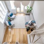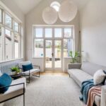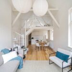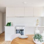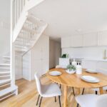 The kitchen has a timeless elegance, with marble-effect composite worktops, warm brass accents and Smeg appliances. LED under-cabinet lighting adds a soft glow in the evenings, while Hay pendant lights in the living area bring a subtle sense of style.