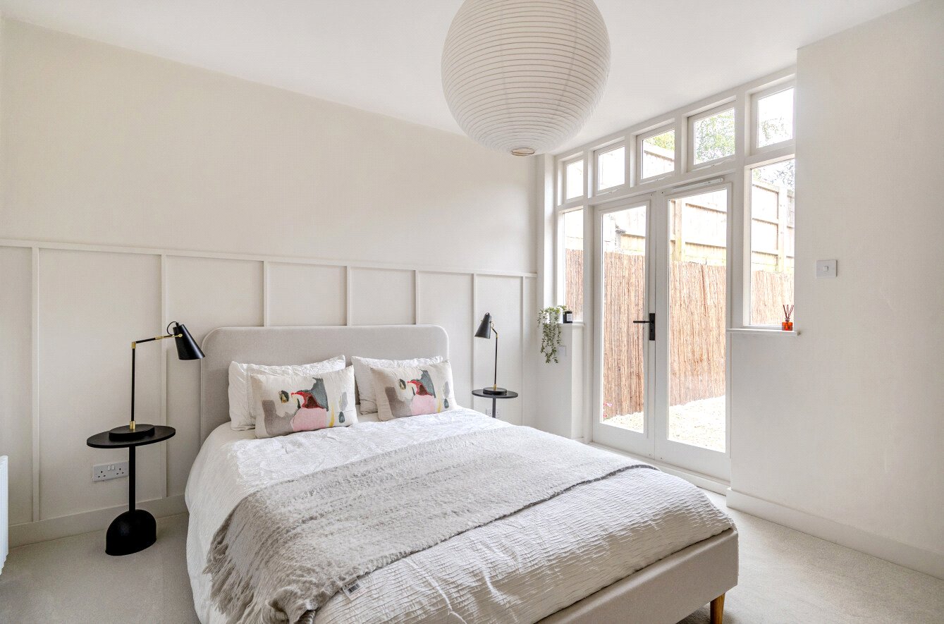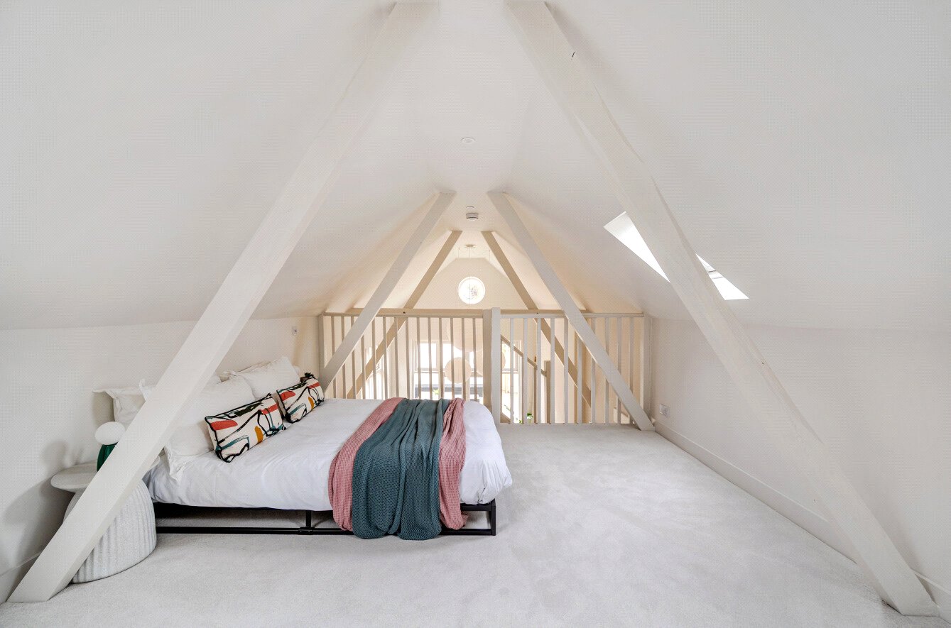 Although the house sits over two floors, the layout on the ground floor makes it ideal for single-storey living. A spacious kitchen/dining/sitting room and principal bedroom both open onto the garden through French doors. There's also a main bathroom featuring brass Scudo fittings and a neat study – or third bedroom – with discreet storage, housing the new boiler, washing machine and wardrobe. ‘Upstairs, there’s a generous loft too, easily accessed through a standard door.'